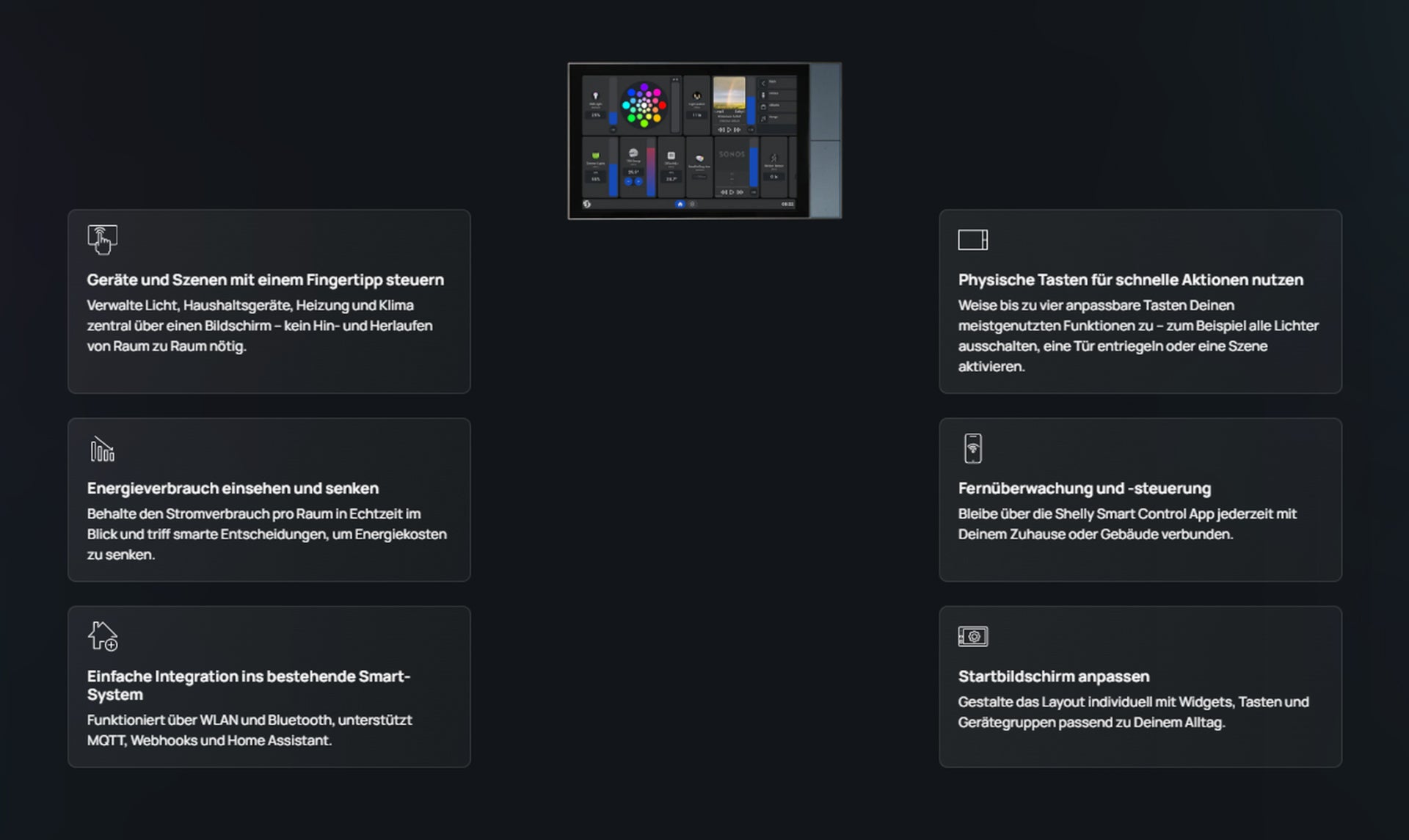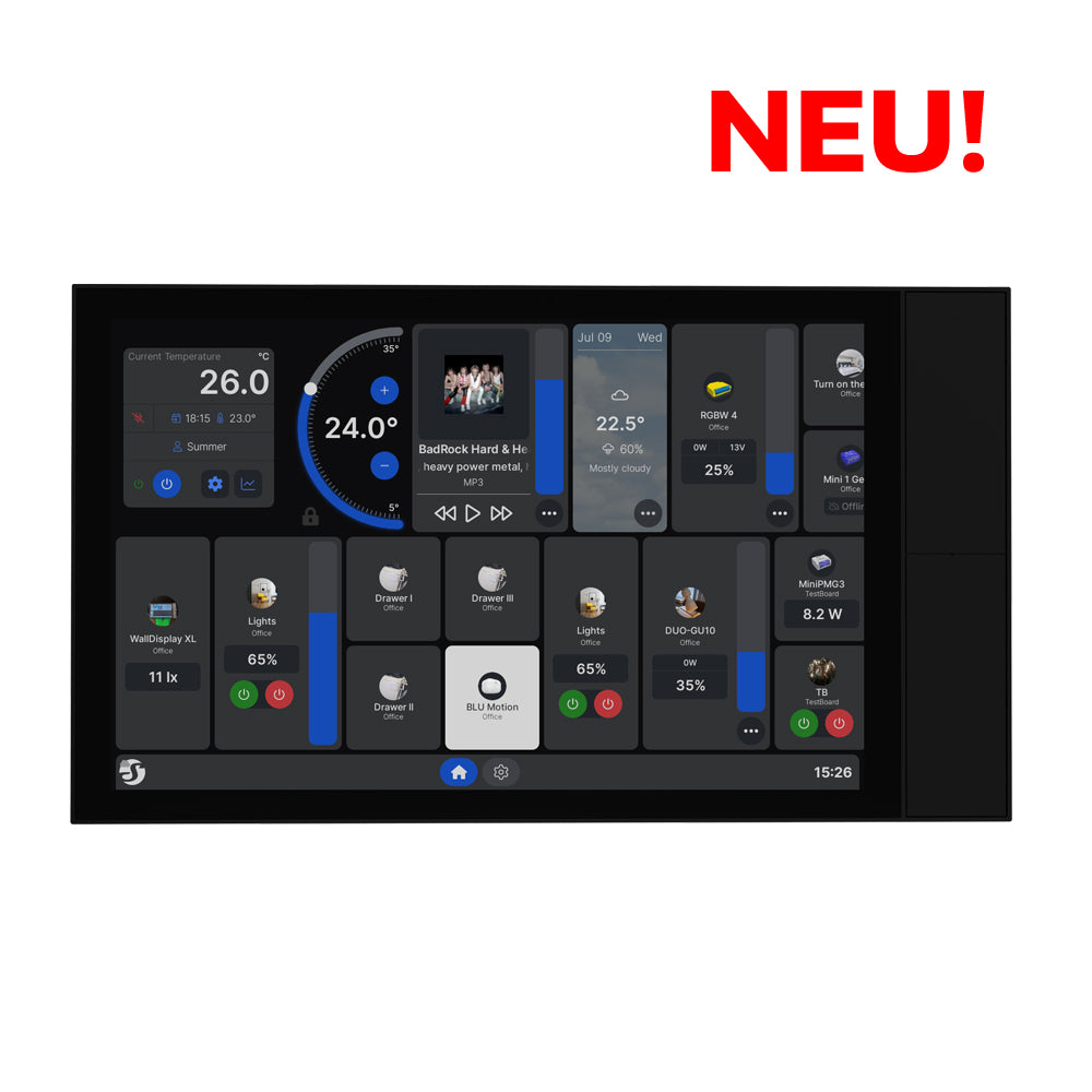 Smart-Home-Bedienpanel mit 10,1"-Touchdisplay, integriertem Schaltrelais und vier individuell konfigurierbaren Tasten. Lässt sich in eine Standard-Unterputzdose installieren und gibt Dir die volle, einfache Kontrolle über Deine Shelly Geräte – ideal für Häuser, Wohnungen, Hotels und Gewerbeflächen.